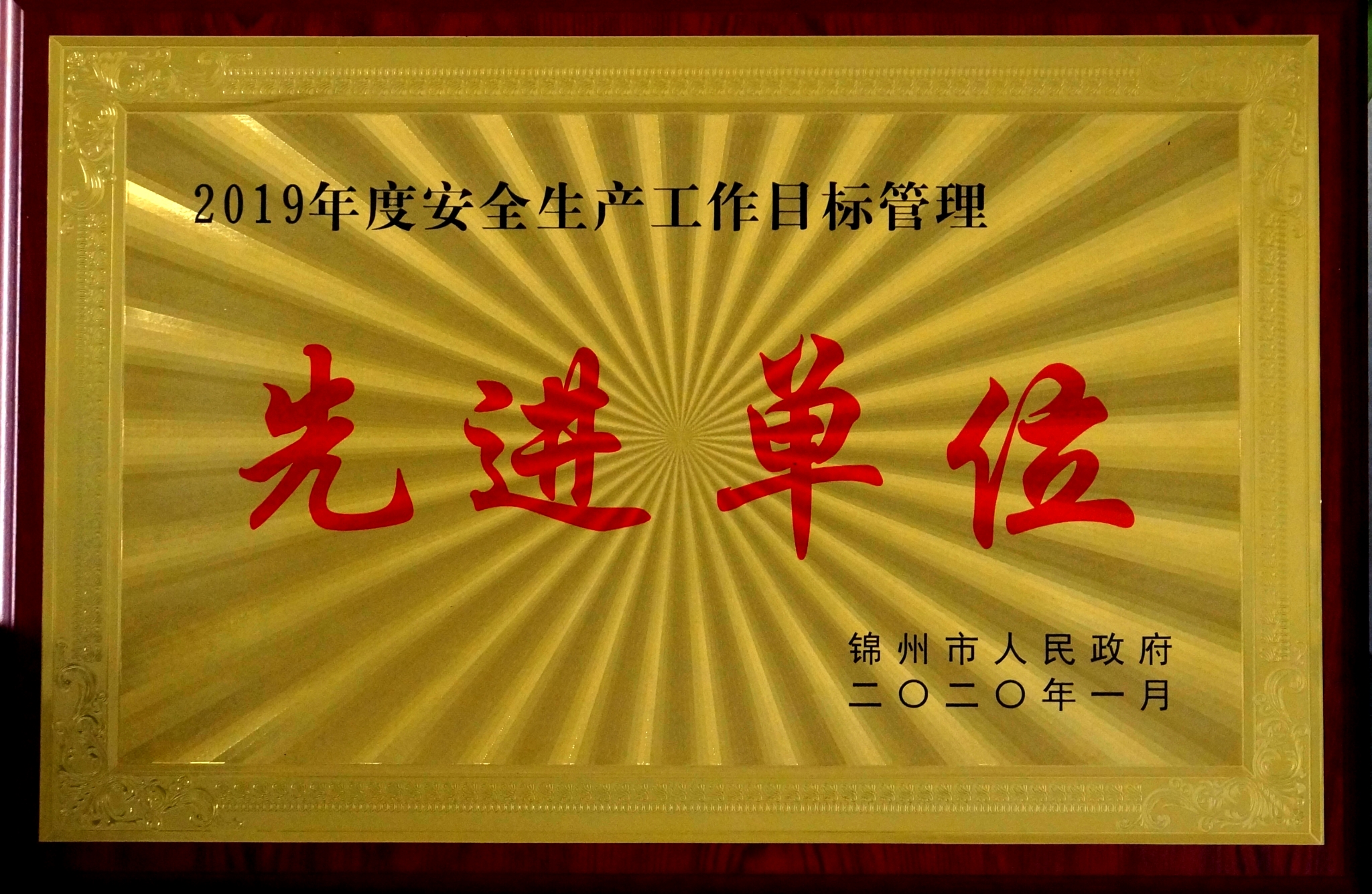 2020年4月,公司被錦州市政府授予“2019年的安全生產(chǎn)工作目標(biāo)管理先進(jìn)單位”榮譽(yù)稱號。